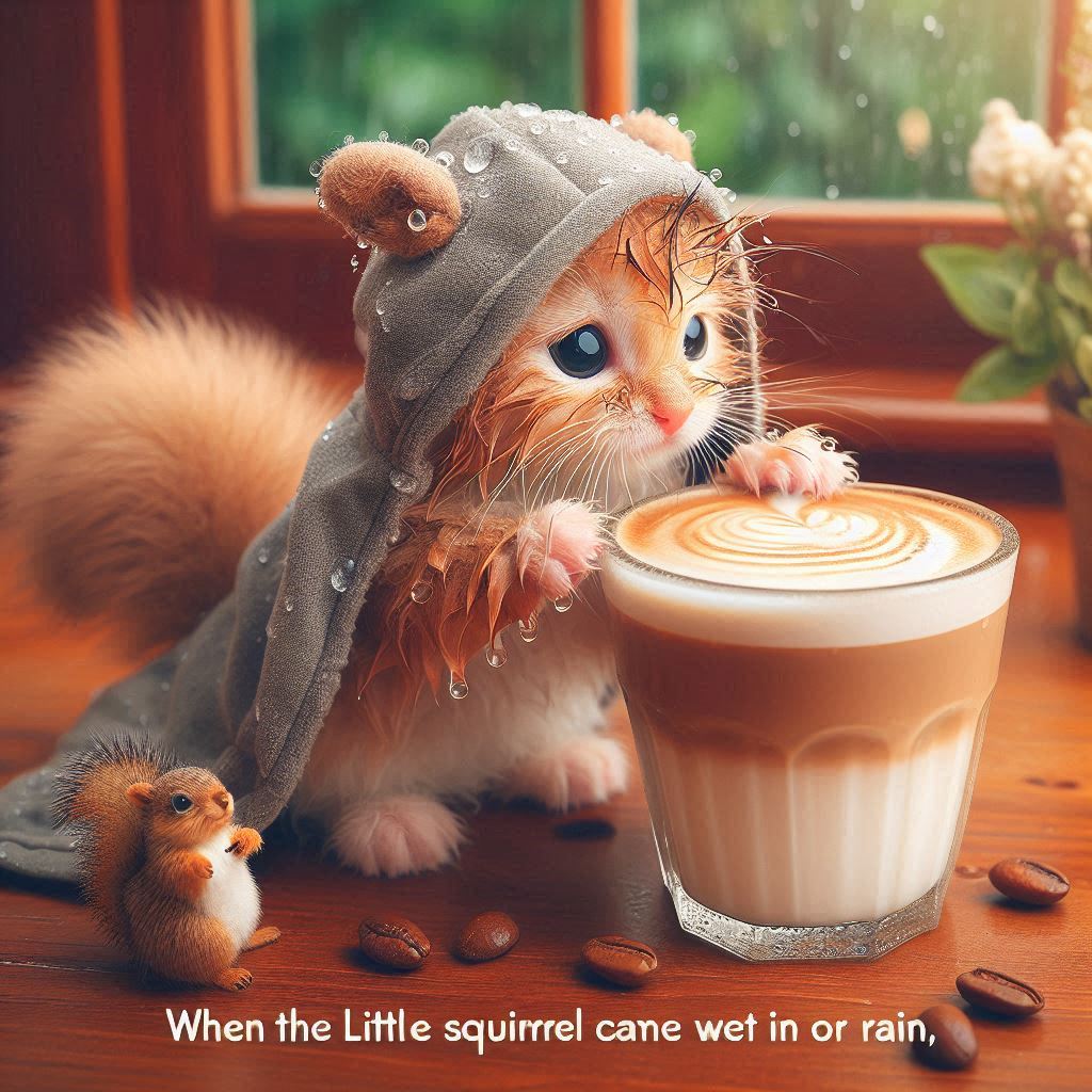 "비에 젖은 꼬마 다람쥐가 들어오자, 고양이 미야오는 조용히 라떼 한 잔을 건넸어요" .그려줘