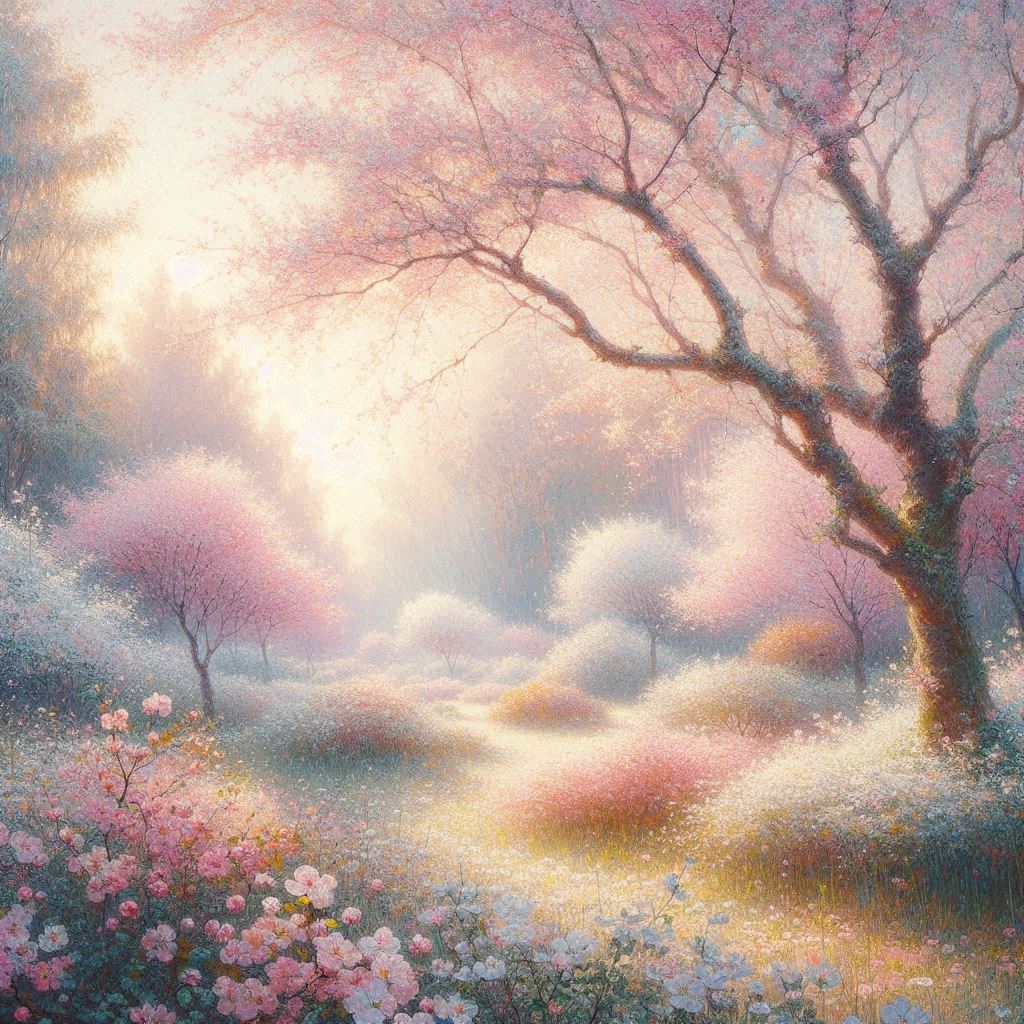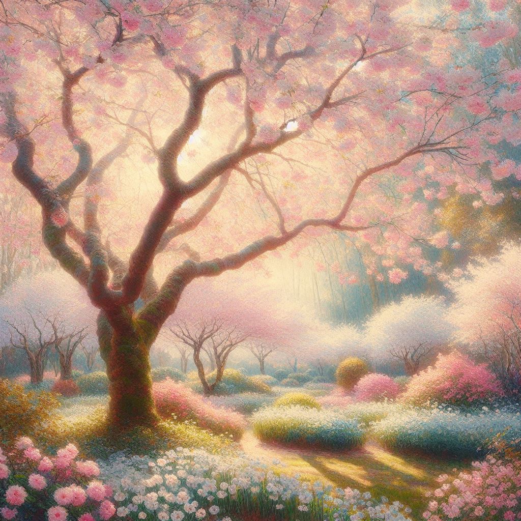 만개한 벚꽃 정원, 클로드 모네 인상주의 스타일로, 부드러운 아침 햇살, 파스텔 핑크와 화이트 색조, 야외 자연광, 플레인 에어 기법, 꽃잎이 흩날리는 효과