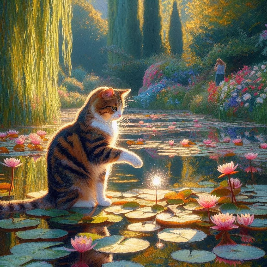 정원의 고양이 마법사, 클로드 모네 스타일, 인상주의, 빛과 그림자, 야외 자연광