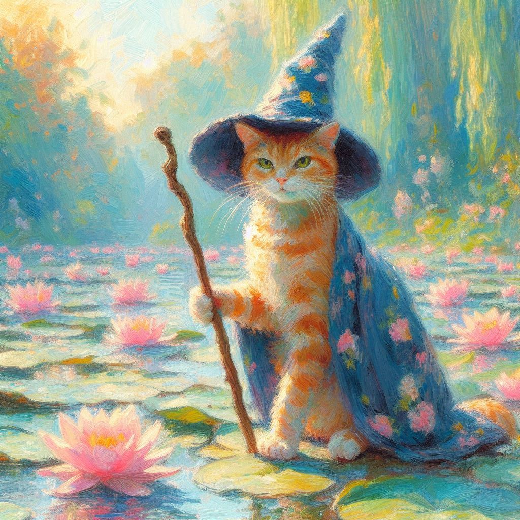 수련 연못가의 고양이 마법사, 클로드 모네 스타일, 인상주의, 부드러운 붓터치, 파스텔 색조, 야외 자연광, 플레인 에어 기법