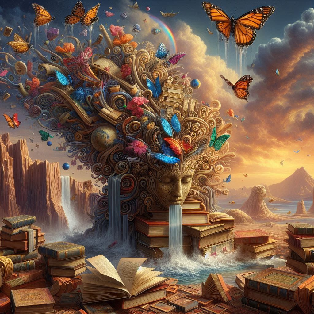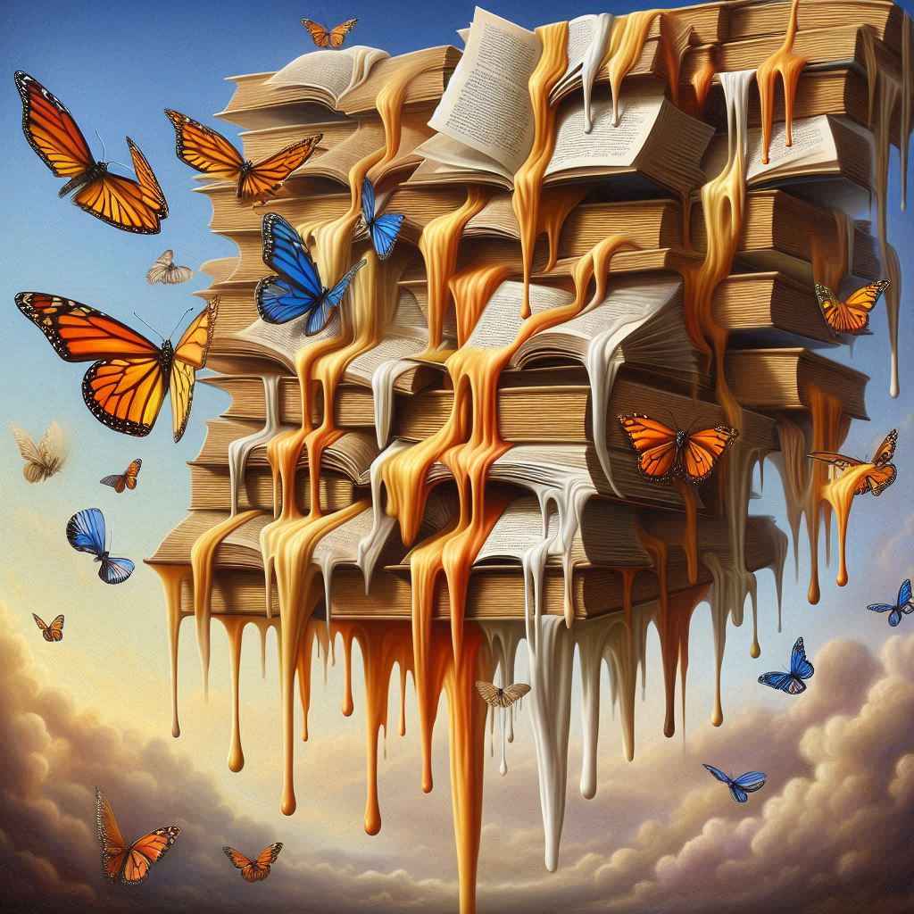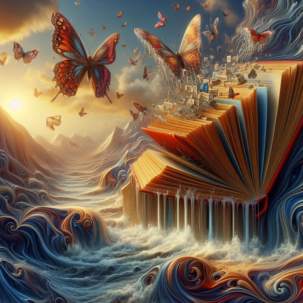 무한대 사막의 녹아내리는 책들과 거대한 나비, 살바도르 달리 초현실주의 스타일, 시간 왜곡, 꿈의 논리, 정밀한 묘사, 환상적 분위기