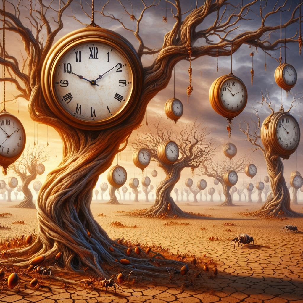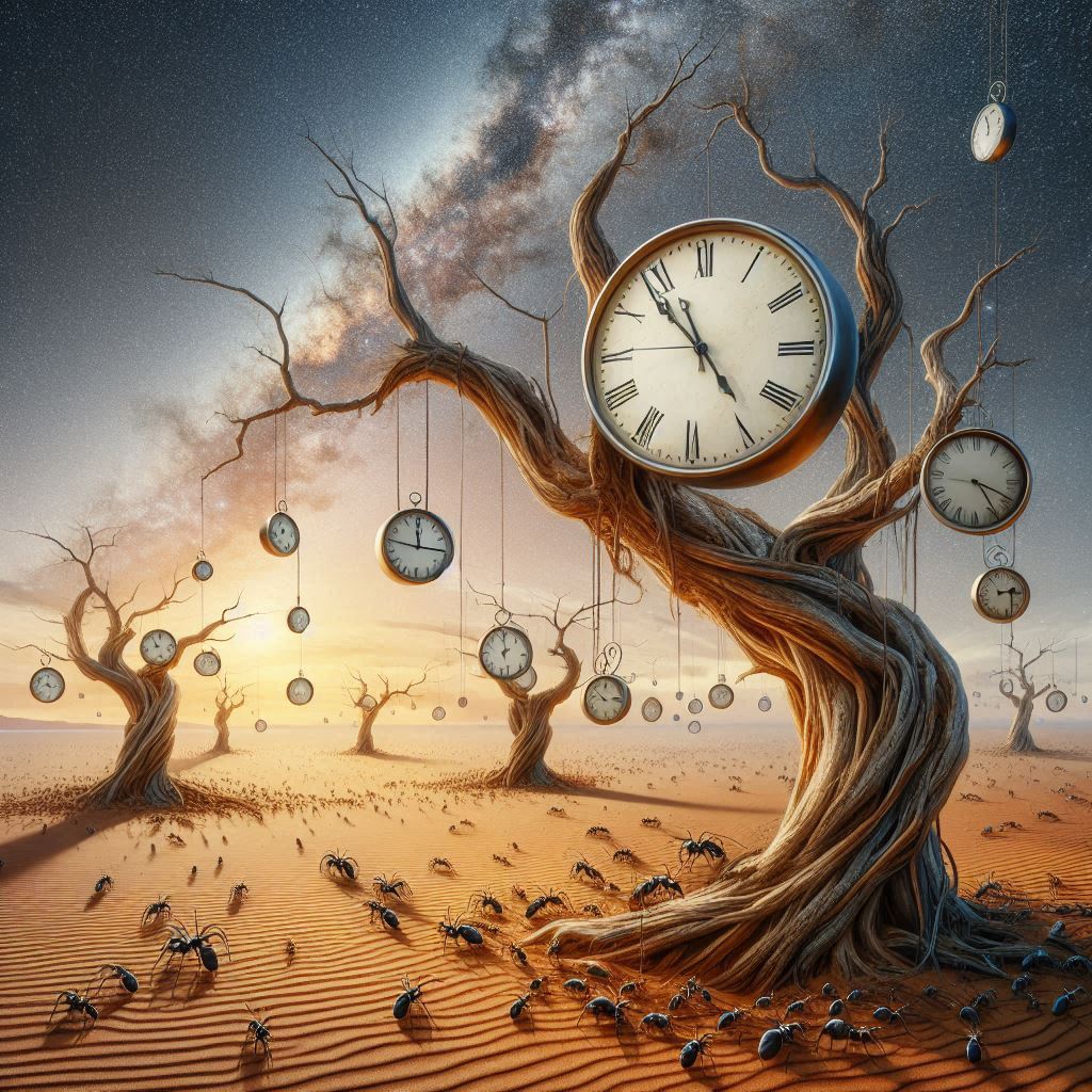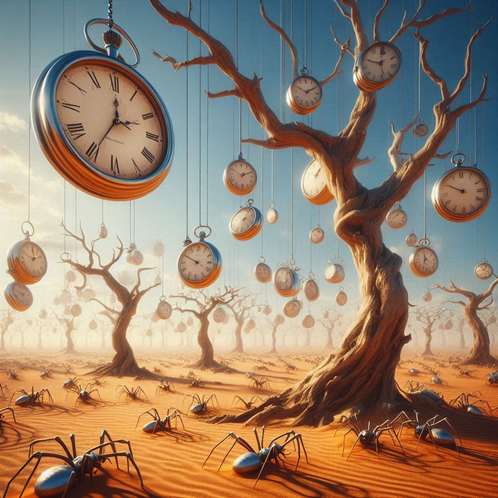 무한대 사막의 말라버린 나무에 걸린 시계들, 살바도르 달리 초현실주의 스타일로, 시간의 왜곡, 개미 떼가 기어다니는 환상적 장면, 정밀한 극사실적 묘사