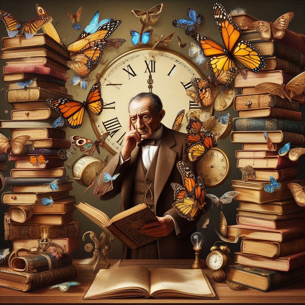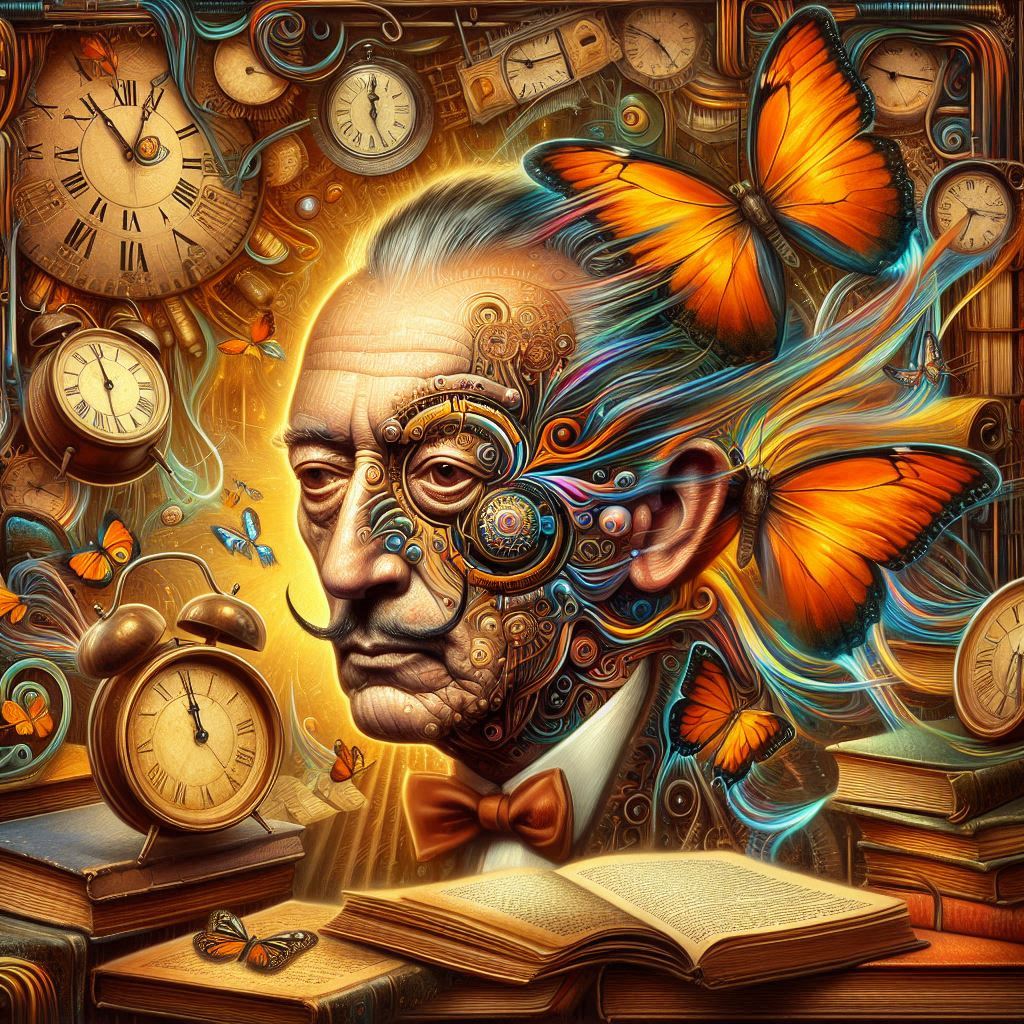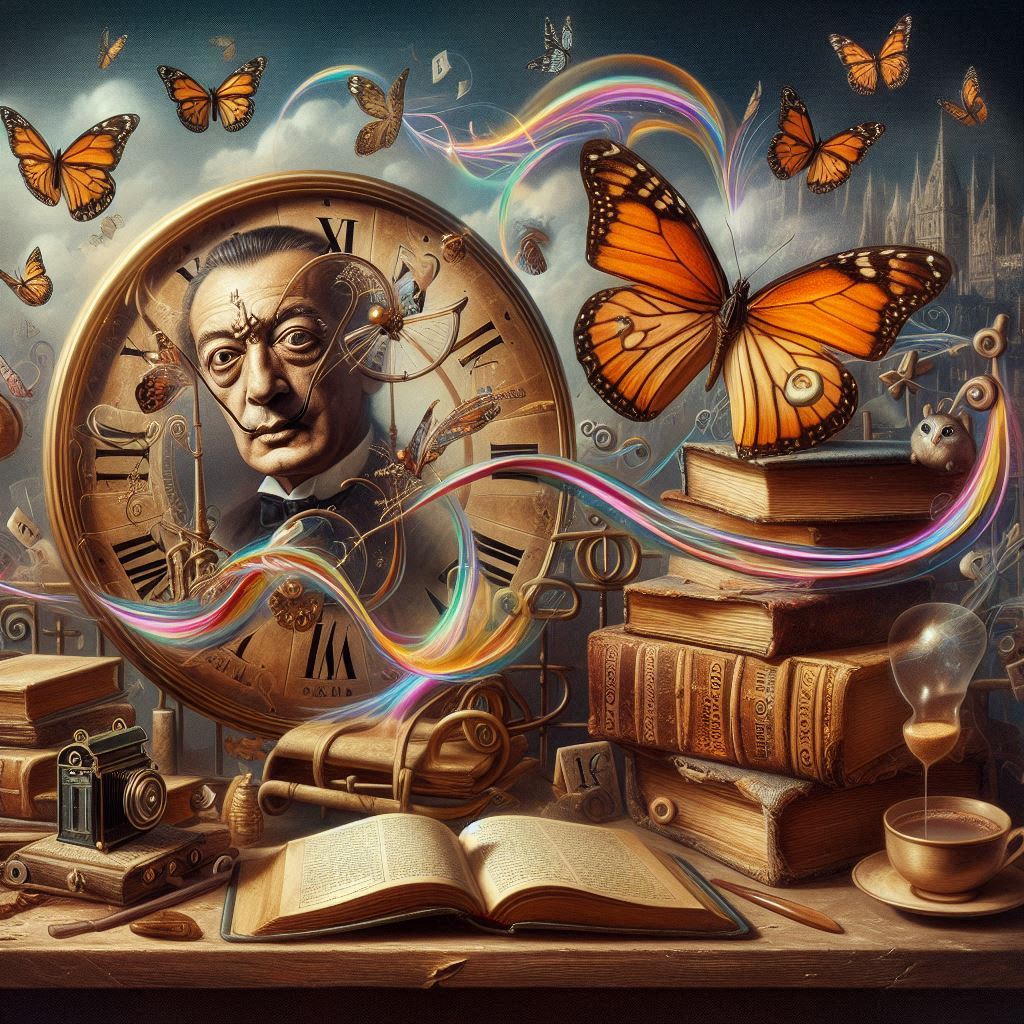 사막의 녹아내리는 책들과 거대한 나비, 살바도르 달리 스타일, 초현실주의, 꿈같은 분위기, 시간이 흐르는 환상적 장면