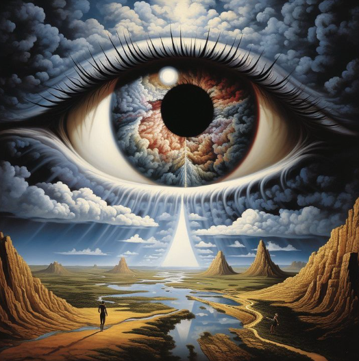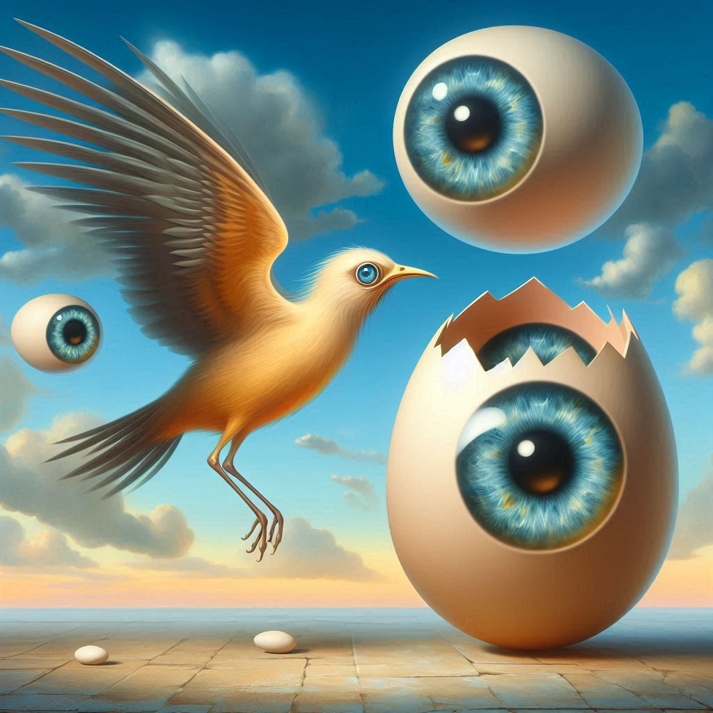 하늘에 떠다니는 거대한 눈과 계란에서 나오는 환상적인 새, 살바도르 달리 초현실주의 스타일로, 무의식의 시각화, 꿈과 현실의 경계, 변형과 탄생의 상징, 정밀한 묘사