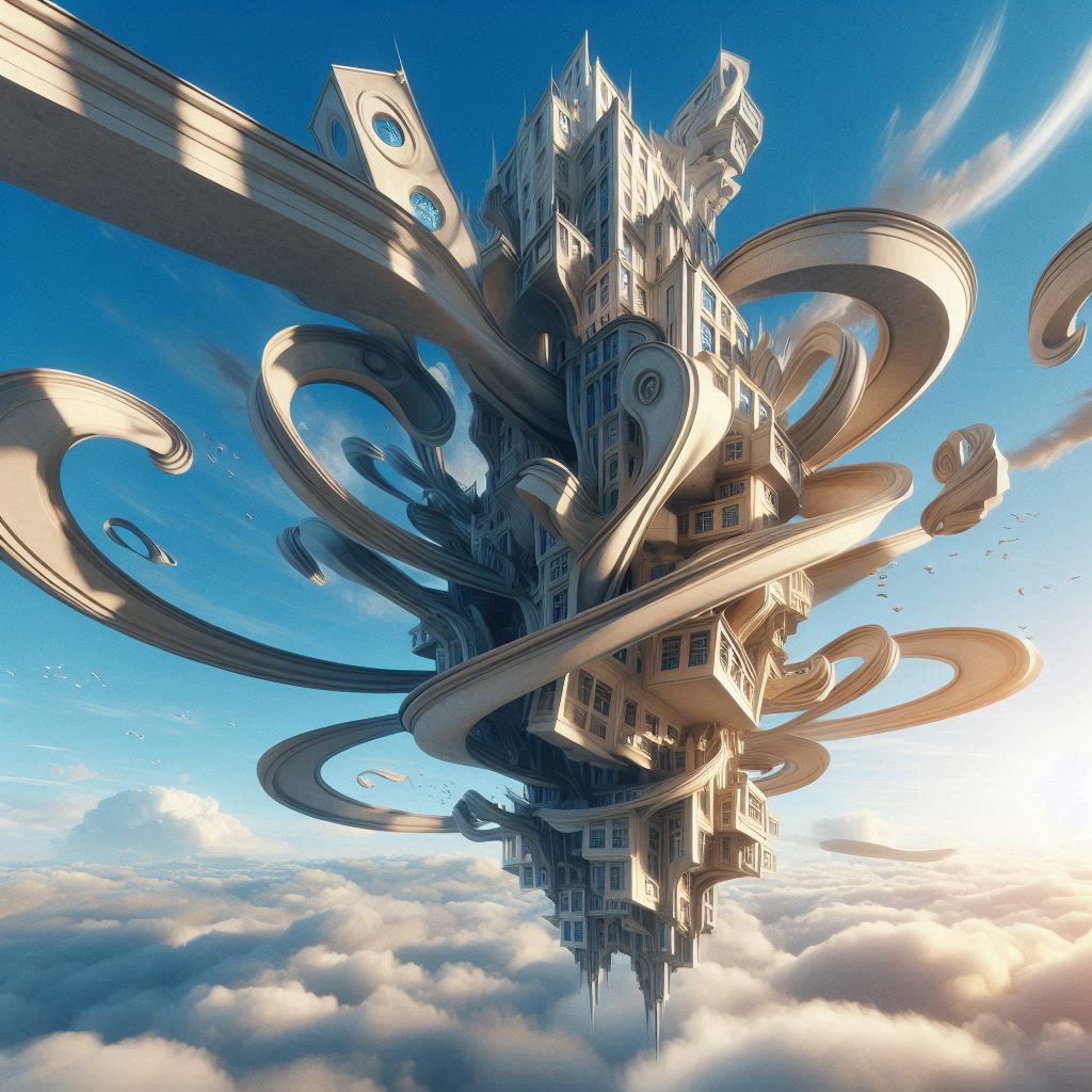 사용된 프롬프트: 하늘에 떠다니는 뒤틀린 건축물, 살바도르 달리 초현실주의 스타일로, 중력을 무시하는 구조물, 꿈의 논리, 무한대 공간, 시간이 멈춘 세계