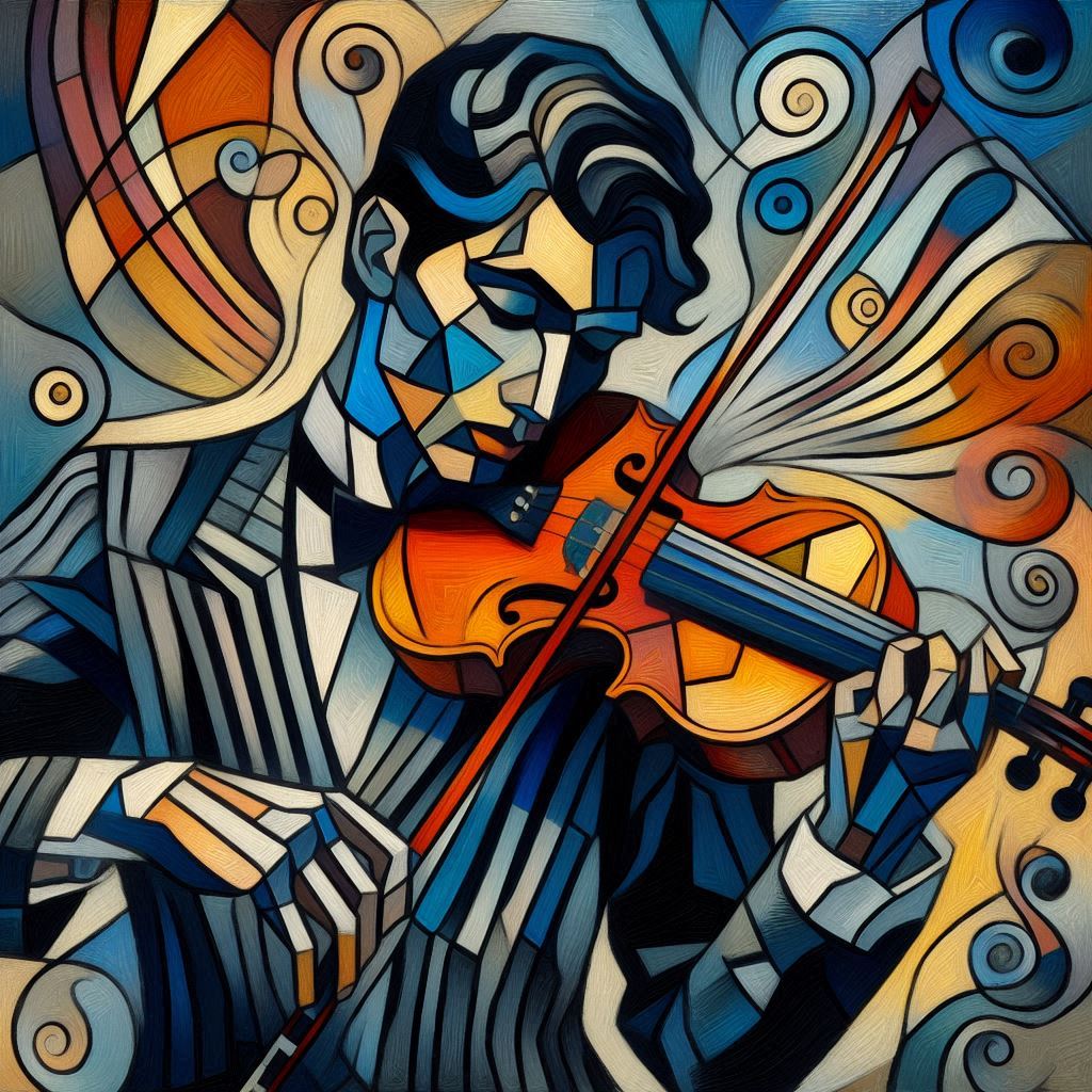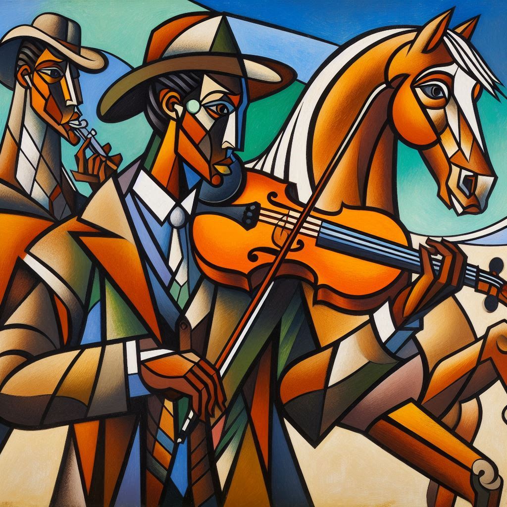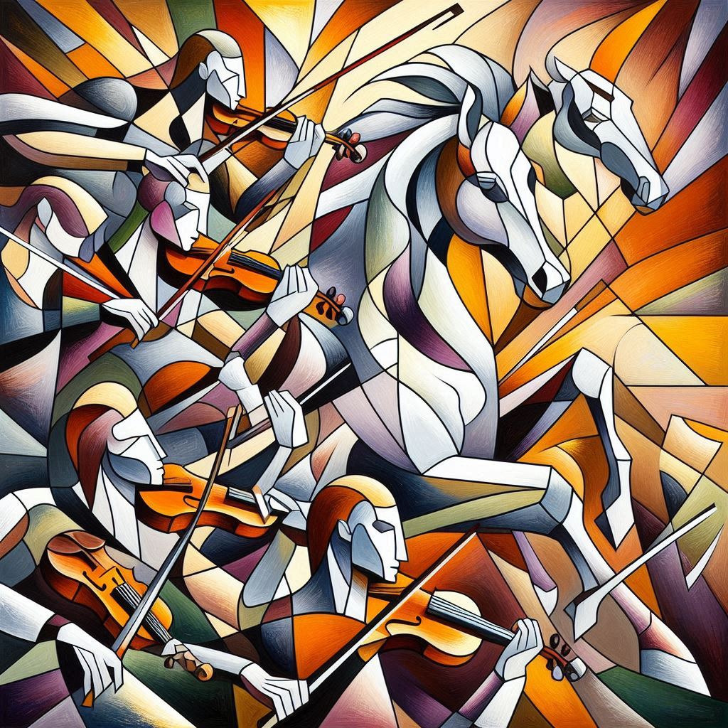 사용된 프롬프트: 바이올린을 연주하는 음악가와 힘찬 말이 어우러진 장면, 파블로 피카소 큐비즘 걸작 스타일로, 기하학적 분해와 재구성
