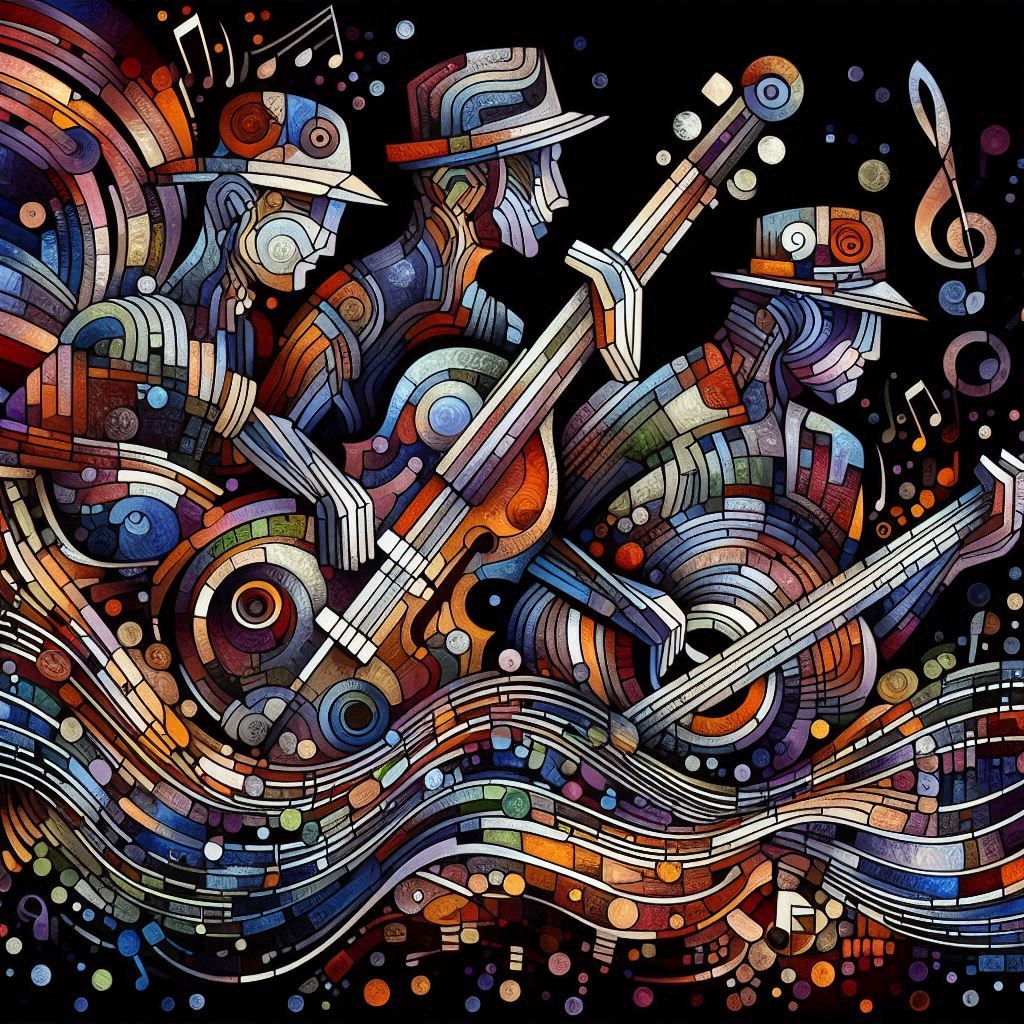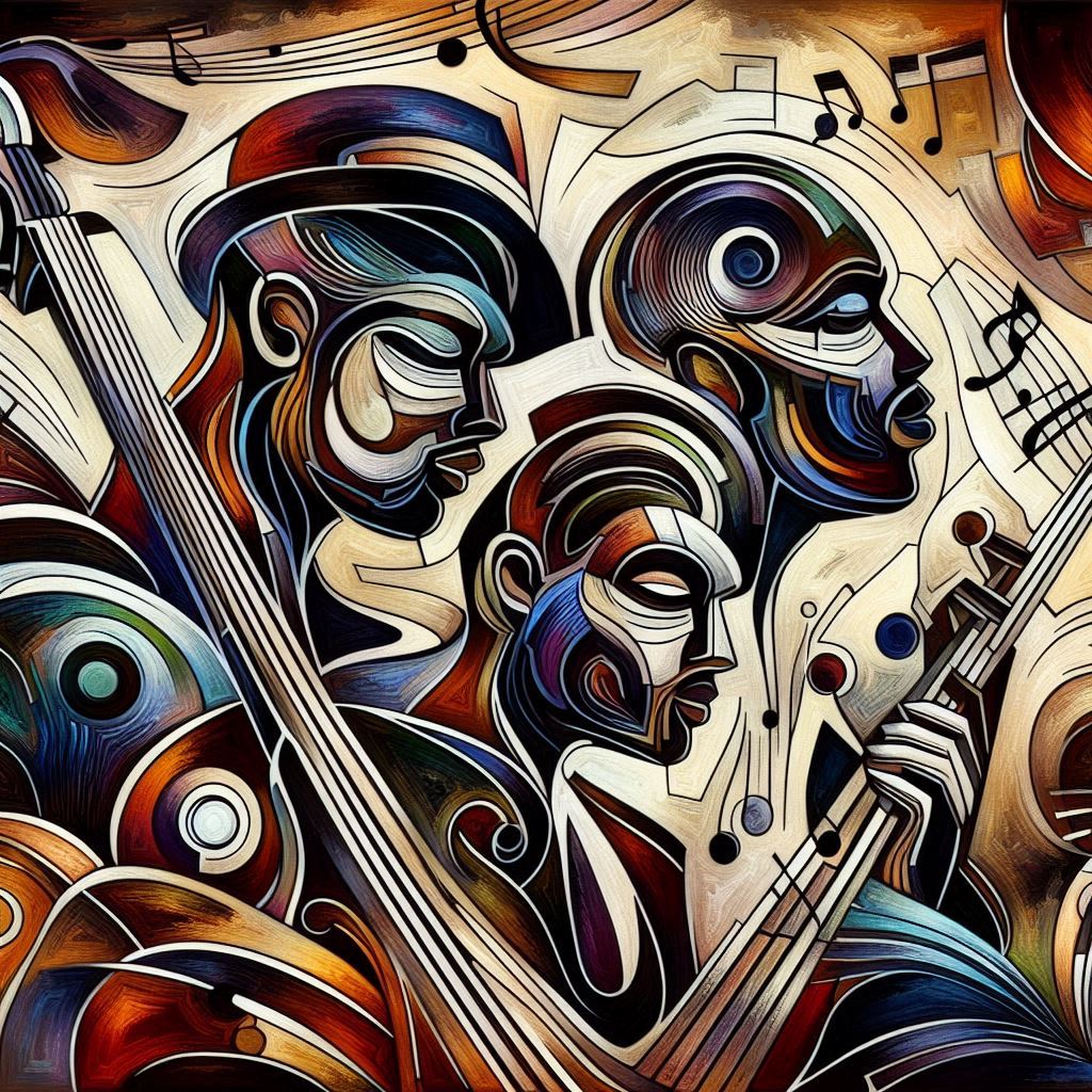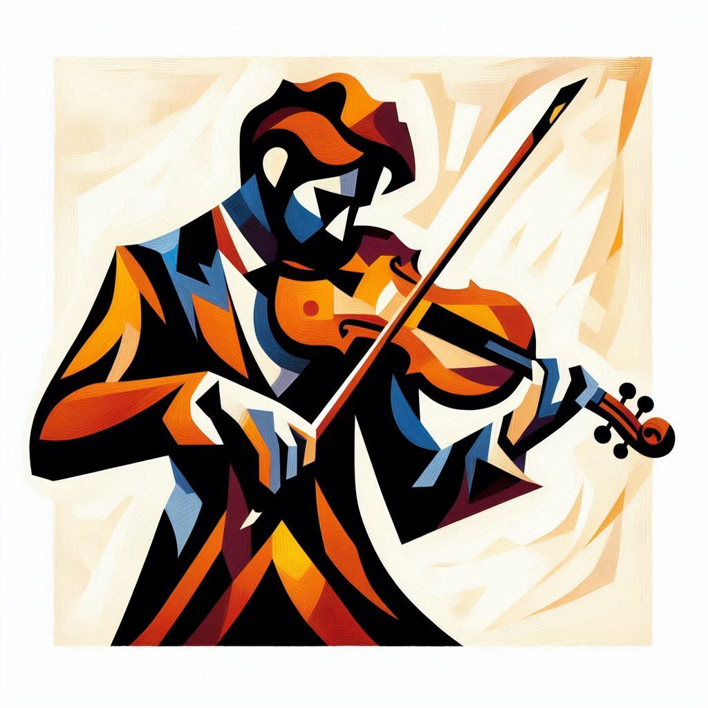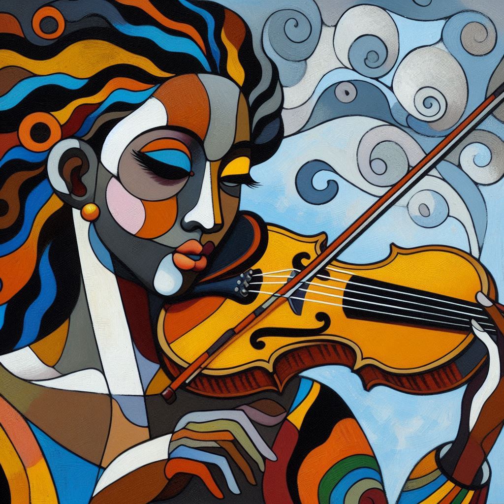 사용된 프롬프트: 바이올린을 연주하는 음악가와 힘찬 말이 어우러진 장면, 파블로 피카소 큐비즘 걸작 스타일로, 기하학적 분해와 재구성