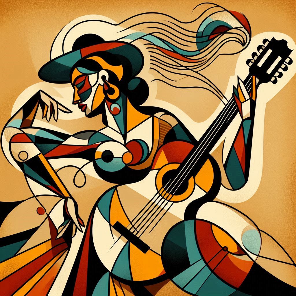 플라멘코 춤추는 여성과 기타, 파블로 피카소 큐비즘 스타일로, 기하학적 형태 분해, 여러 시점 동시 표현, 추상적 인물화, 강렬한 윤곽선, 역동적 움직임