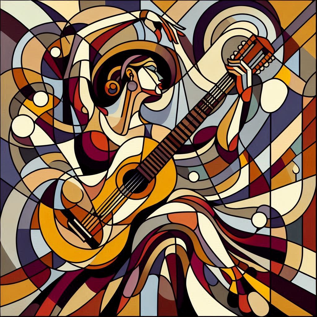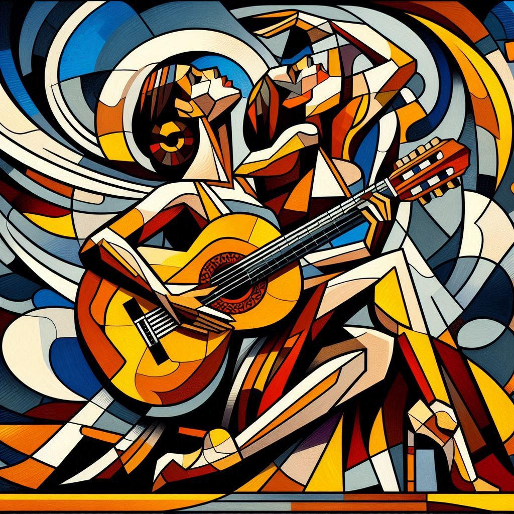 사용된 프롬프트: 플라멘코 춤추는 여성과 기타, 파블로 피카소 큐비즘 스타일로, 기하학적 형태 분해, 여러 시점 동시 표현, 추상적 인물화, 강렬한 윤곽선, 역동적 움직임